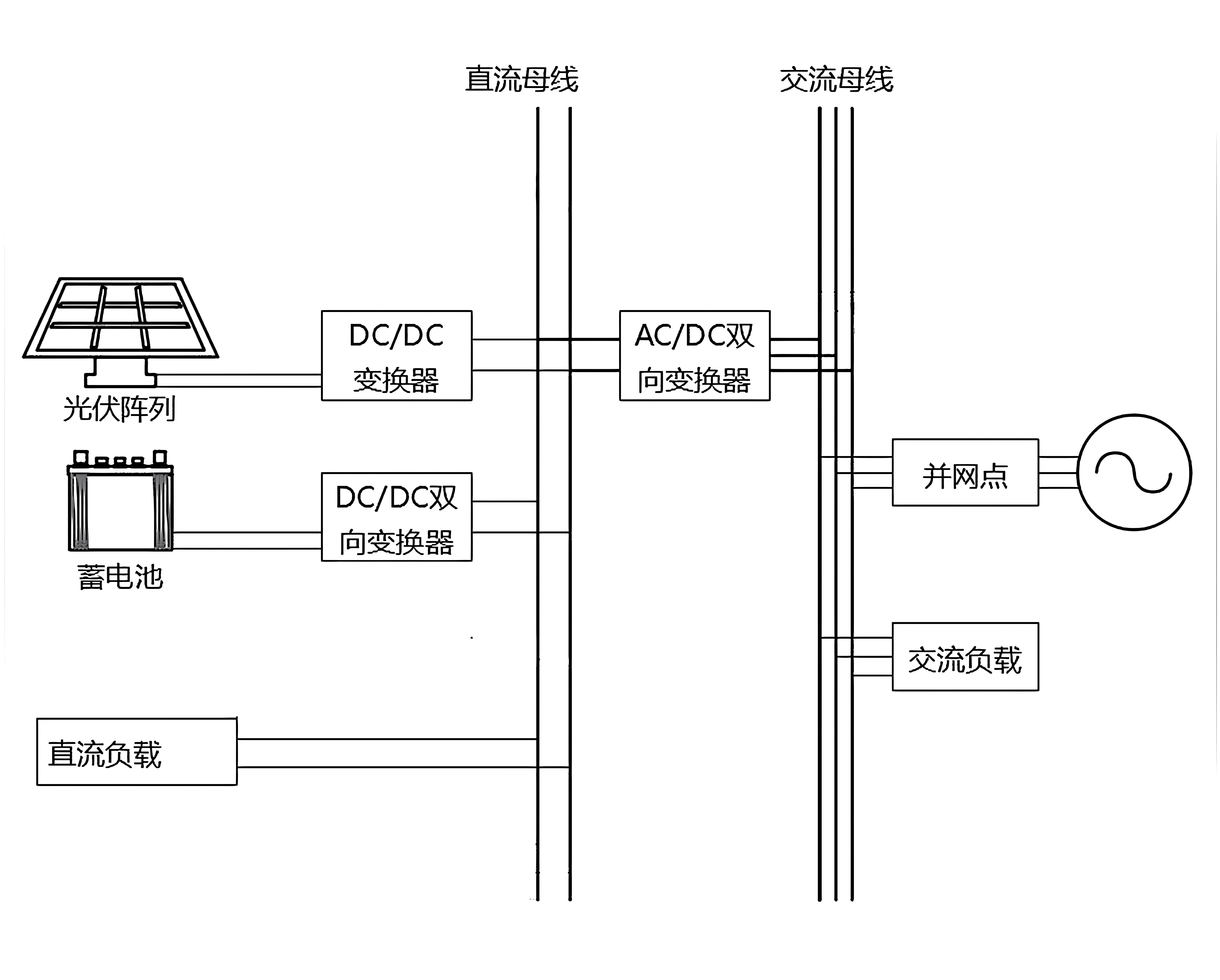 仿真模型由光伏PV及其DC/DC变换器、储能及其双向DC/DC变换器、直流负载、逆变器、交流负载、断路器以及交流主网组成的光储(三相)交直流微电网。逆变器并网状态采用恒PQ控制,离网孤岛运行采用恒V/f控制,由并网转为孤岛运行。