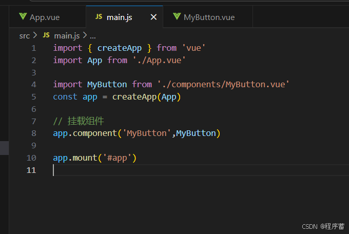 import { createApp } from 'vue' import App from './App.vue'import MyButton from './components/MyButton.vue' const app = createApp(App)// 挂载组件 app.component('MyButton',MyButton)app.mount('#app')