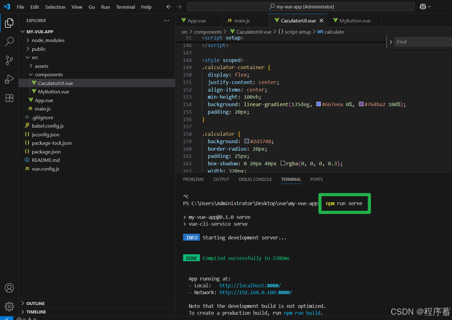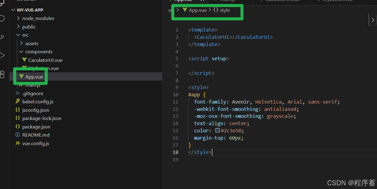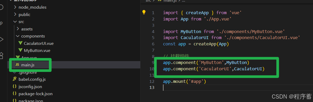 import { createApp } from 'vue' import App from './App.vue'import MyButton from './components/MyButton.vue' import CaculatorUI from './components/CaculatorUI.vue' const app = createApp(App)// 挂载组件 app.component('MyButton',MyButton) app.component('CaculatorUI',CaculatorUI)app.mount('#app')