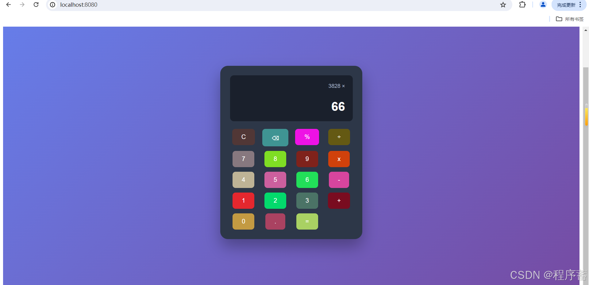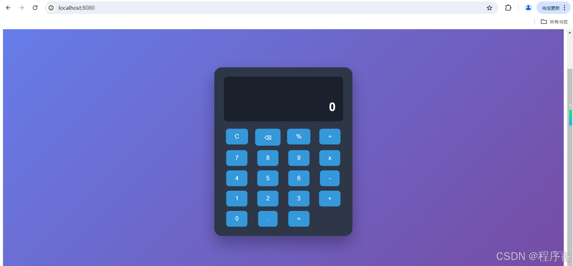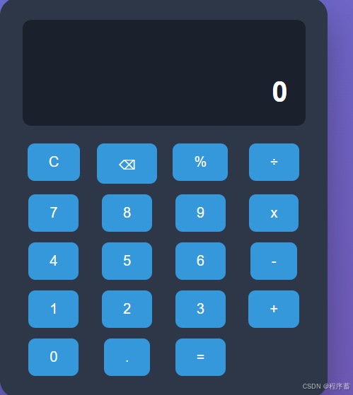 <template><div class="calculator-container"><div class="calculator"><!-- 显示屏 --><div class="display"><div class="previous-operand">{{ previousOperand }} {{ operation }}</div><div class="current-operand">{{ currentOperand || '0' }}</div></div><!-- 按钮区域 --><div class="buttons"><!-- 第一行 --><MyButton :buttonText="'C'" @click="clear">C</MyButton><MyButton :buttonText="'⌫'" @click="deleteLast"></MyButton><MyButton :buttonText="'%'" @click="appendOperation('%')">%</MyButton><MyButton :buttonText="'÷'" @click="appendOperation('÷')">÷</MyButton><!-- 第二行 --><MyButton :buttonText="'7'" @click="appendNumber('7')">7</MyButton><MyButton :buttonText="'8'" @click="appendNumber('8')">8</MyButton><MyButton :buttonText="'9'" @click="appendNumber('9')">9</MyButton><MyButton :buttonText="'x'" @click="appendOperation('×')">×</MyButton><!-- 第三行 --><MyButton :buttonText="'4'" @click="appendNumber('4')">4</MyButton><MyButton :buttonText="'5'" @click="appendNumber('5')">5</MyButton><MyButton :buttonText="'6'" @click="appendNumber('6')">6</MyButton><MyButton :buttonText="'-'" @click="appendOperation('-')">-</MyButton><!-- 第四行 --><MyButton :buttonText="'1'" @click="appendNumber('1')" ></MyButton><MyButton :buttonText="'2'" @click="appendNumber('2')"></MyButton><MyButton :buttonText="'3'" @click="appendNumber('3')"></MyButton><MyButton :buttonText="'+'" @click="appendOperation('+')"></MyButton><!-- 第五行 --><MyButton :buttonText="'0'" @click="appendNumber('0')">0</MyButton><MyButton :buttonText="'.'" @click="appendNumber('.')">.</MyButton><MyButton :buttonText="'='" @click="calculate">=</MyButton></div></div></div> </template><script setup> import { ref } from 'vue'// 计算器状态 const currentOperand = ref('') const previousOperand = ref('') const operation = ref('') const shouldResetScreen = ref(false)// 添加数字 const appendNumber = (number) => {if (shouldResetScreen.value) {currentOperand.value = ''shouldResetScreen.value = false}// 防止多个小数点if (number === '.' && currentOperand.value.includes('.')) return// 防止以0开头(除了0.)if (number === '0' && currentOperand.value === '0') returnif (number !== '.' && currentOperand.value === '0') {currentOperand.value = numberreturn}currentOperand.value += number }// 添加操作符 const appendOperation = (op) => {if (currentOperand.value === '' && previousOperand.value === '') returnif (currentOperand.value === '') {operation.value = opreturn}if (previousOperand.value !== '') {calculate()}operation.value = oppreviousOperand.value = currentOperand.valueshouldResetScreen.value = true }// 计算结果 const calculate = () => {if (previousOperand.value === '' || currentOperand.value === '' || operation.value === '') returnconst prev = parseFloat(previousOperand.value)const current = parseFloat(currentOperand.value)if (isNaN(prev) || isNaN(current)) returnlet computationswitch (operation.value) {case '+':computation = prev + currentbreakcase '-':computation = prev - currentbreakcase '×':computation = prev * currentbreakcase '÷':computation = prev / currentbreakcase '%':computation = prev % currentbreakdefault:return}currentOperand.value = computation.toString()operation.value = ''previousOperand.value = ''shouldResetScreen.value = true }// 清空 const clear = () => {currentOperand.value = ''previousOperand.value = ''operation.value = '' }// 删除最后一位 const deleteLast = () => {if (currentOperand.value === '') returncurrentOperand.value = currentOperand.value.slice(0, -1) } </script><style scoped> .calculator-container {display: flex;justify-content: center;align-items: center;min-height: 100vh;background: linear-gradient(135deg, #667eea 0%, #764ba2 100%);padding: 20px; }.calculator {background: #2d3748;border-radius: 20px;padding: 25px;box-shadow: 0 20px 40px rgba(0, 0, 0, 0.3);width: 320px; }/* 显示屏样式 */ .display {background: #1a202c;border-radius: 10px;padding: 20px;margin-bottom: 20px;text-align: right;min-height: 80px;display: flex;flex-direction: column;justify-content: space-between; }.previous-operand {color: #a0aec0;font-size: 14px;min-height: 20px; }.current-operand {color: white;font-size: 32px;font-weight: bold;word-wrap: break-word;word-break: break-all; }/* 按钮布局 */ .buttons {display: grid;grid-template-columns: repeat(4, 1fr);gap: 12px; }</style>