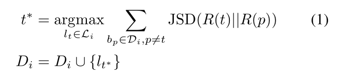 该目标函数通过计算检测特征向量的詹森 - 香农散度(JSD),优先选择与现有检测器具有多样性的边界框。每次迭代中,我们将选中的边界框数量限制为 10 个。当该选择方法无法找到新的边界框时,我们认为半监督学习已达到饱和点,以此作为算法的停止准则。