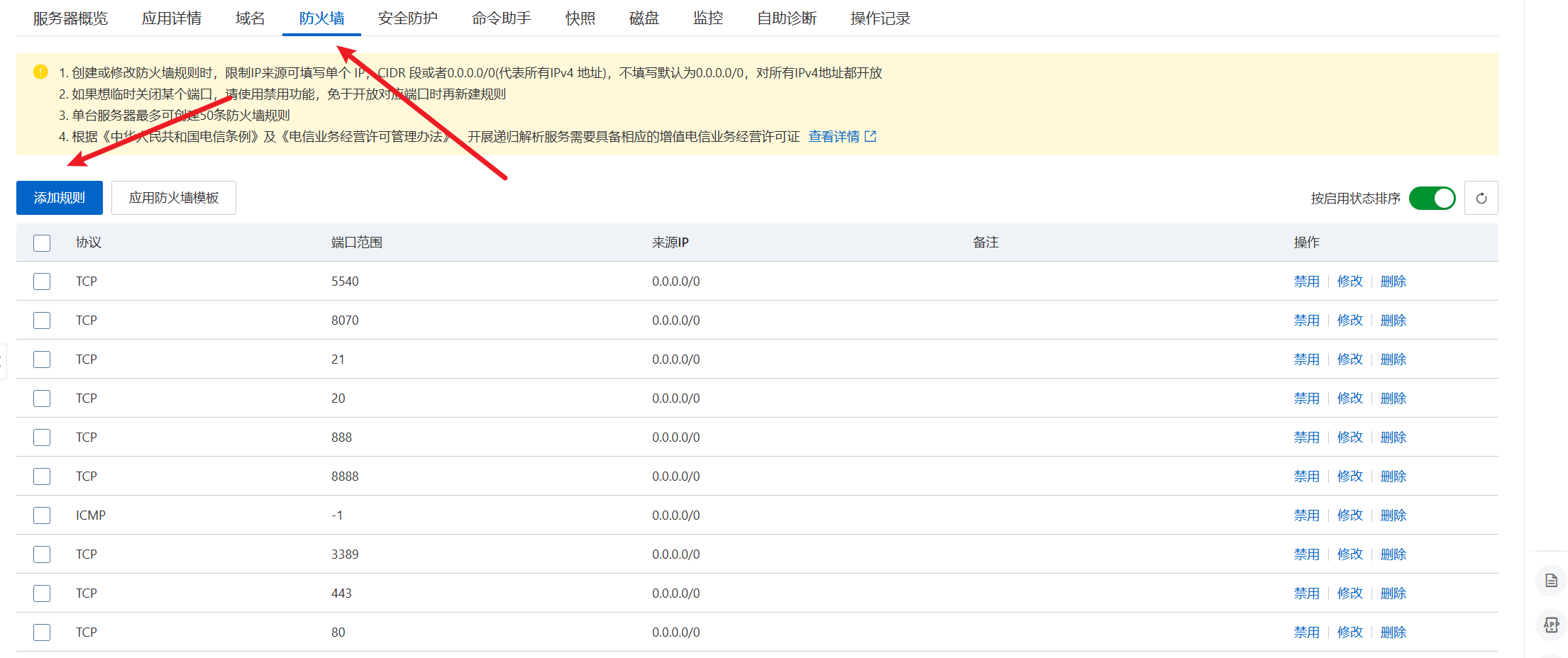 把面板上的注意事项上面的端口添加规则就欧克,然后以后的前后端的端口也是这边放行