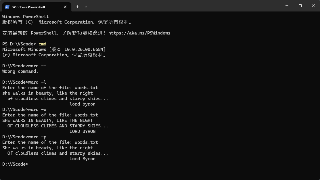 3. 先输入word -u或-l或-p,进入程序提示输入文件名称,输入words.txt(放在和word.exe同一个目录下面),终端输出结果: