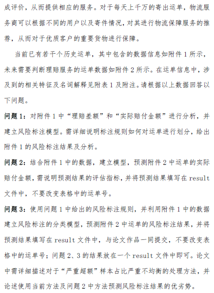 再来说赛道B,物流理赔风险识别,这个适合玩表格数据的同学,比如数据科学、统计学、金融工程,要是物流管理专业的同学懂业务,上手会更顺,因为这个赛道全是跟运单相关的表格数据,不用碰图片。第一个问题是给运单分三类:“合理诉求”“诉求偏高”“严重超额”,核心是根据“理赔差额”(实际赔的钱减客户要的钱)和“实际赔付金额”来划界限。这一步不用急着建模,得先“摸透数据规律”——比如画个直方图看看,“合理诉求”的差额是不是堆在一起很密集,“严重超额”的是不是散在外面很稀疏,还得符合业务要求:严重超额的运单不能超过3%,合理诉求的得不少于85%。具体做的时候,先画散点图、直方图看看数据分布,再用K-means聚成3类,或者按“实际赔付金额”分档——比如100块以下、100到500块、500块以上,每档里再按差额的分位数划界,比如每档里差额最小的5%算严重超额,这样既符合数据规律,又能满足业务占比要求。这里要注意别“一刀切”,比如实际赔1000块和赔100块的运单,就算差额一样,也不能归为一类,必须按赔付金额分档定标准,不然就不符合实际业务逻辑了。