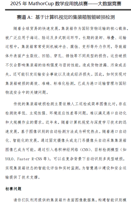 先看赛道A,集装箱破损检测这块,适合的学生得是玩过图片识别的,比如计算机科学、人工智能、自动化这些专业,尤其是平时接触过“看图片找东西”的同学,上手会快很多。咱们先讲第一个问题:判断图片里的集装箱有没有残损。这是A赛道里最基础的活,不用找破损在哪,就给个“有”或“没有”的答案,有点像你刷手机看图,判断“这张图里有没有猫”一样,只是对象换成了集装箱的破损。用到的模型也不用自己从零搭,像ResNet、EfficientNet这些现成的图片分类框架,网上一搜全是代码,改改输入输出就能用。但重点不在模型多复杂,而在“处理图片”——你想啊,港口的图片里乱七八糟的,有机器、天空、地面,还有反光、阴影、下雨天的水痕,这些都容易让模型认错,得先给图片“做个大扫除”,比如裁掉没用的背景、调调亮度去掉阴影;另外,没残损的图片可能比有残损的多好多,要是模型光看这些“没问题”的图,最后可能就偷懒只认“没残损”,漏了真正有问题的,所以得想办法平衡数据,比如多复制点有残损的图,或者少用点没残损的图,这才是这个问题的关键。