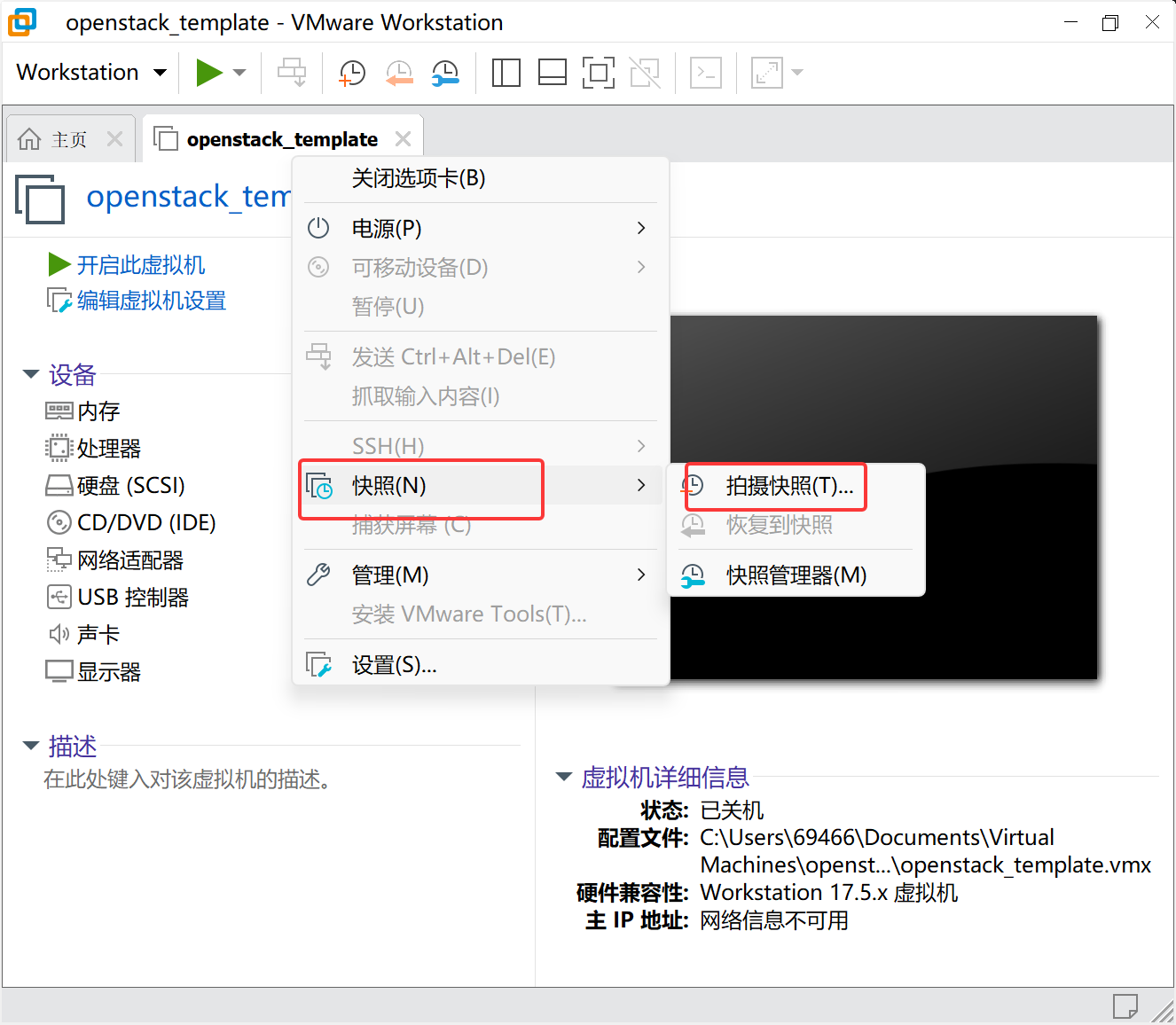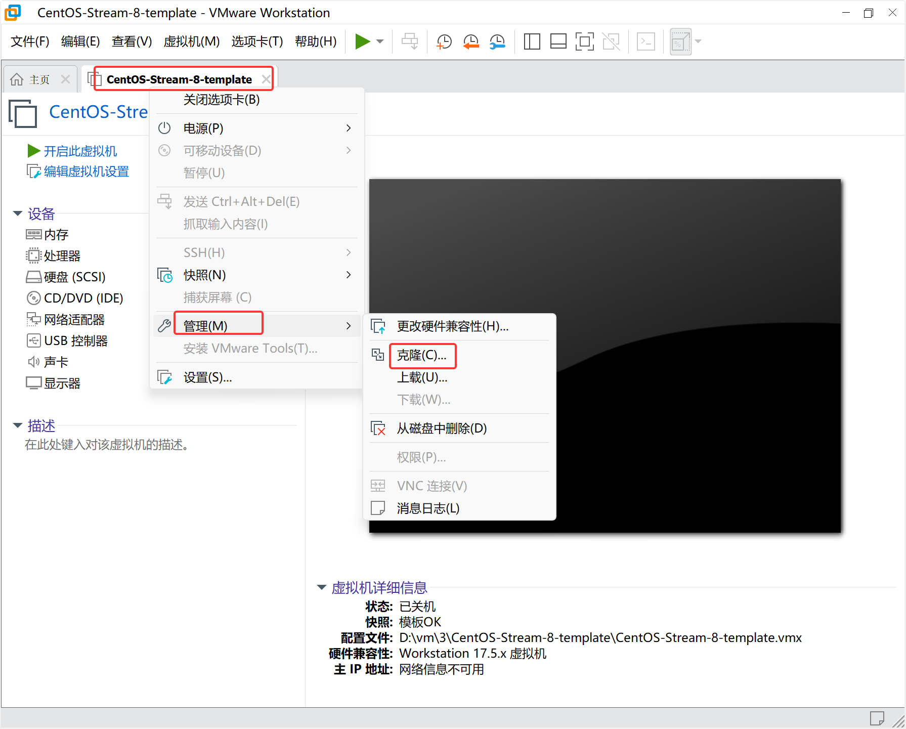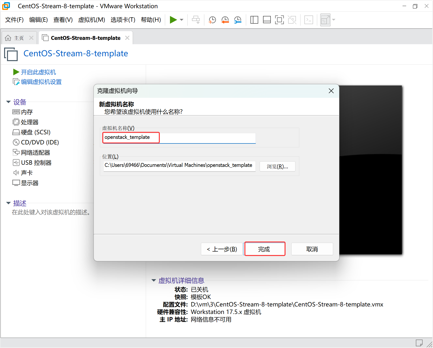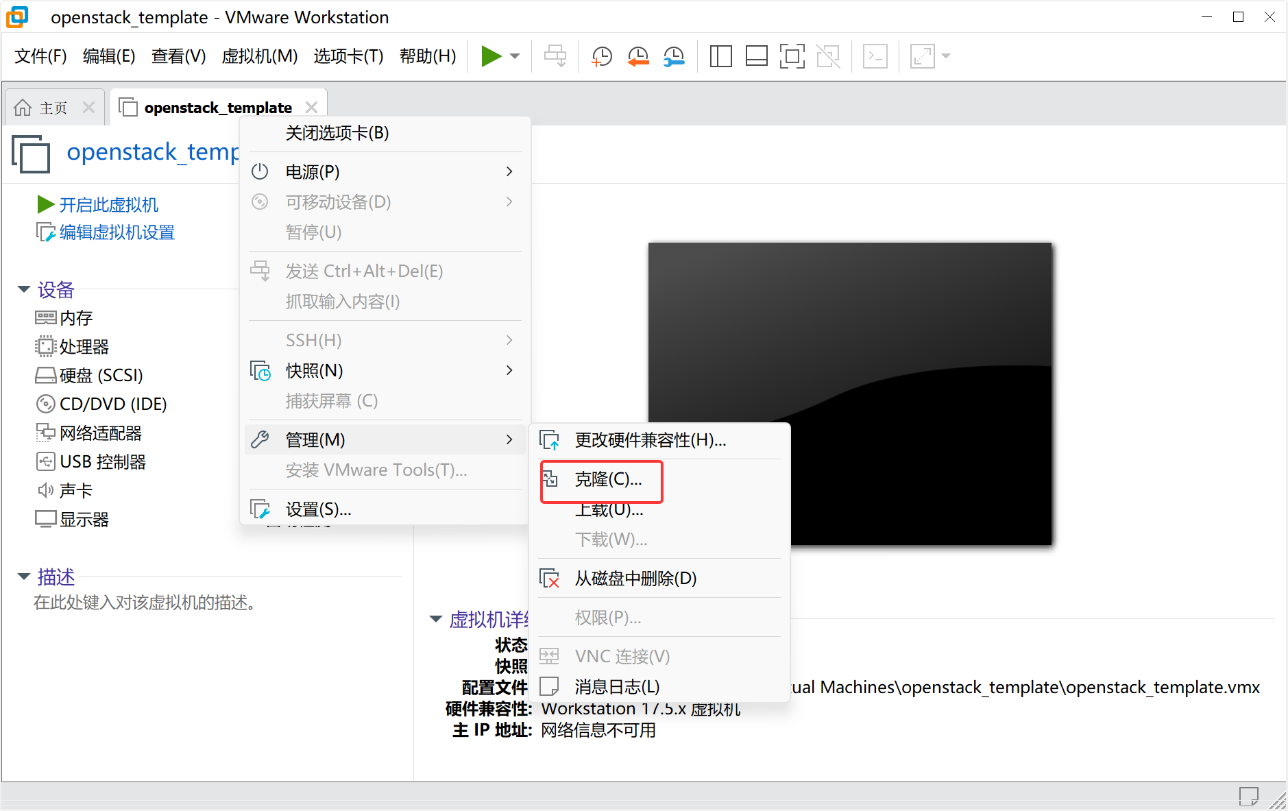 基于CentOS-Stream-8模板制作.md制作的模板,克隆出一个虚拟机(openstack_template),作为openstack模板虚拟机