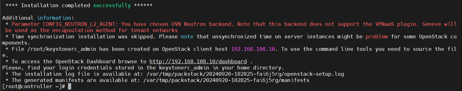 Additional information:* Parameter CONFIG_NEUTRON_L2_AGENT: You have chosen OVN Neutron backend. Note that this backend does not support the VPNaaS plugin. Geneve will be used as the encapsulation method for tenant networks