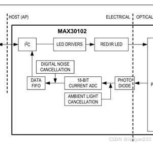 MAX30102内部功能模块如下图所示,还包括了众多小模块,如I2C接口、数据缓存、LED驱动器、RED/IR LED红光/红外光等等。
