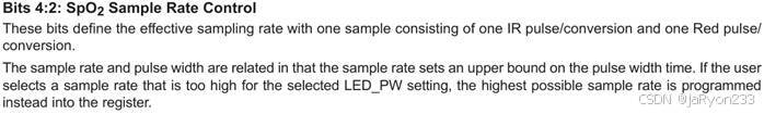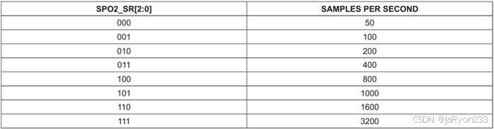 Bits 4 - 2(SpO₂ Sample Rate Control)定义有效采样率,一个样本包含一次红外脉冲/转换和一次红光脉冲/转换。配置这三位的数值组合,可对应不同的每秒采样数,从 50 到 3200 不等。不过采样率和脉冲宽度相关,若所选采样率对于当前 LED 脉冲宽度设置过高,该寄存器可能会被设置为最高可能的采样率,配置数值与采样率对照表如下图所示。