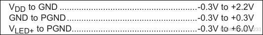 VLED+ to PGND:-0.3V 到 + 6.0V,是 LED 驱动电源(VLED+)相对于保护地(PGND)的极限电压,微控制器若为 LED 供电或控制相关电源,需确保电压在此范围。