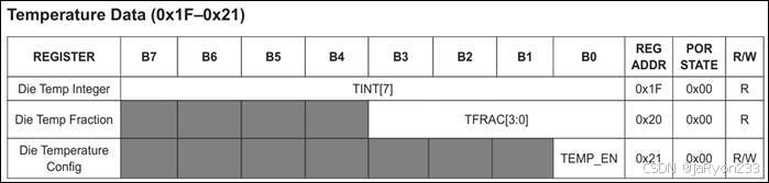 Temperature Data相关寄存器(地址0x1F - 0x21)用于温度相关功能,分别是温度整数寄存器、温度小数寄存器以及温度配置寄存器。