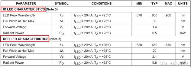 RED/IR LED,即前面提到的红光或红外光,这是用于发射特定波长的光的器件。该器件与外部进行交互,用于照射人体组织(如手指、耳垂等),其中RED光波长≈660nm、IR光波长≈880nm;