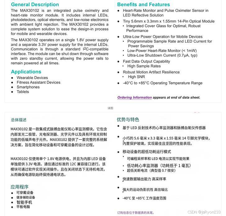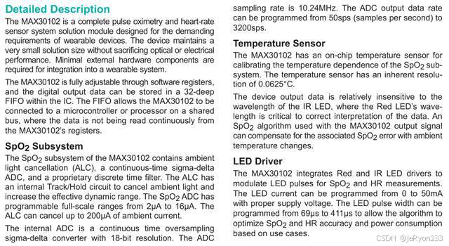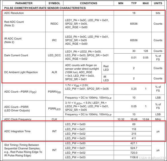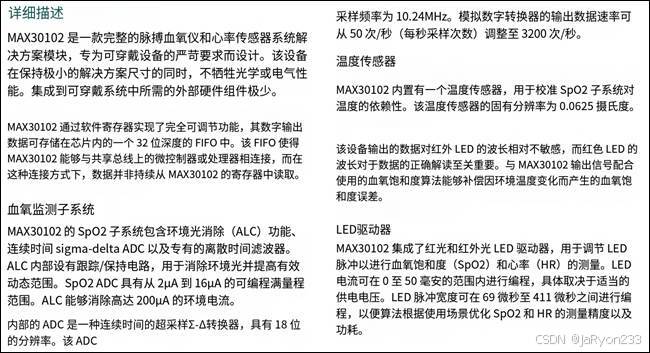 注:除此之外,还有热阻,封装等参数未提及,可参考MAX30102芯片手册自行查看,这里不过多赘述。