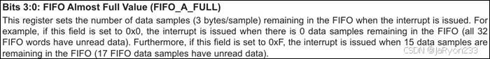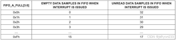 Bits 3-0:FIFO Almost Full Value(FIFO_A_FULL),即FIFO近满中断阈值,与前面的近满中断相对应。该位包含3位,用于设置 FIFO 近满中断阈值,值为剩余空样本数(0~15)。例如 0x0F 表示剩余 15 个空样本时触发中断,提醒主机及时读取。具体数值对应如下表所示。