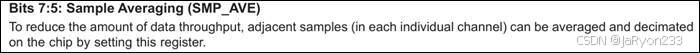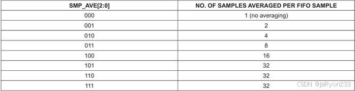 Bits 7-5:Sample Averaging(SMP_AVE),即采样均值,占3位。用于设置数据采样的平均次数,可对多次采样数据进行平均处理,以此来减少数据吞吐量,降低数据中的噪声,同时减少需要传输和处理的数据量,在一些对数据传输带宽或处理能力有限的场景下很有用。通过3位的二进制序列组合对应不同的平均次数,如下图所示。