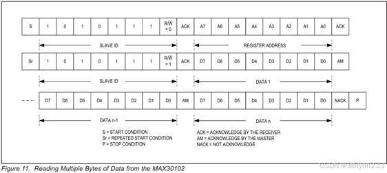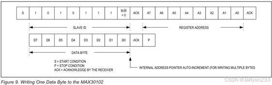 注:一般主机通过I2C读取寄存器时,地址指针会自动递增,可连续读取所有寄存器,但 MAX30102 的FIFO_DATA寄存器(地址 0x07)例外,读取它时地址不自动递增,连续读取会反复读同一地址。而每个样本包含多字节数据,因此需要一次同时从该寄存器读取多字节以获取完整样本。