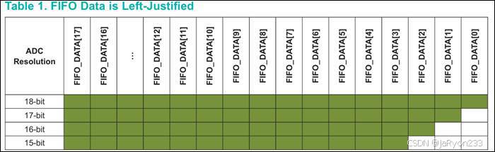 FIFO 数据是左对齐的,这与前面介绍的温湿度传感器DHT11的数据格式类似,如下表所示;换句话说,无论 ADC 分辨率如何设置,最高有效位(MSB)始终位于第 17 位数据位置。