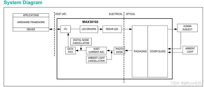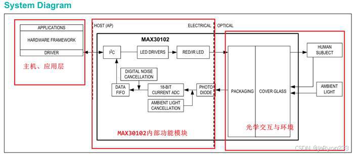 上图是MAX30102传感器的系统框图,展示了该传感器从光学信号采集到数字数据输出的完整工作流程,以及外设或处理器间的交互逻辑。整个系统框图可以分为主机与软件层、MAX30102内部功能模块以及光学交互与环境三大板块,如下图所示。