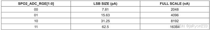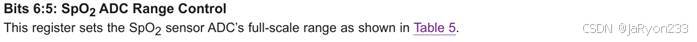 Bits 6 - 5(SpO₂ ADC Range Control)用于设置血氧传感器 ADC 的满量程范围。通过配置这两位的数值,可对应不同的最低有效位(LSB)大小和满量程值,实际使用时可根据血氧信号的幅度范围选择合适的量程,确保信号能被准确采集,配置对应流程表如下。