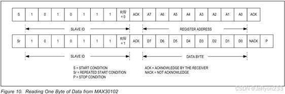 MAX30102遵循标准化I2C协议,因此关于I2C协议的数据格式以及信号等不再赘述。主要包括起始信号、停止信号、应答信号与非应答信号、写数据与读数据等,同时数据格式为8位或11位,其中从机地址一般为7位或10位,再包括一位读写方向位。
