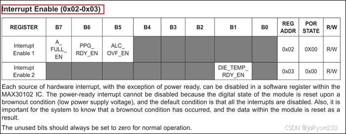 这是两个8位的中断使能寄存器,分别是中断使能1寄存器(0x02)和中断使能2寄存器(0x03),主要用于管理中断使能与禁止。