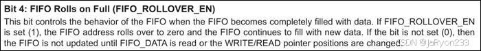 Bit 4:FIFO Rolls on Full(FIFO_ROLLOVER_EN),即FIFO满时滚动使能。该位用于使能或禁用 FIFO 的回绕功能,当 FIFO 已满时,若该功能使能,新数据会覆盖旧数据,否则新数据无法写入,其中置1使能、置0禁止。