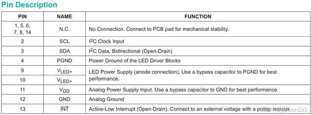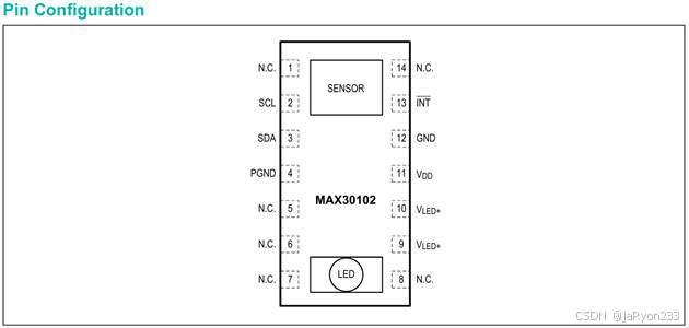 了解了相关电气参数,还需要对芯片引脚功能及连接方式做一个详细了解,不然仍然无法理解如何控制MAX30102芯片。因此接下来我们在了解一下芯片引脚定义及功能介绍。