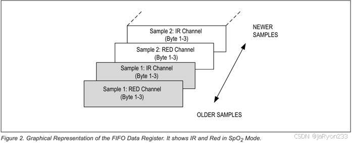 数据FIFO由一个可存储 32 个样本的存储区组成,能够存储红外(IR)和红光(Red)的 ADC 数据。由于每个样本包含两个通道的数据,因此每个样本有 6 字节的数据,所以 FIFO 总共可存储 192 字节的数据。