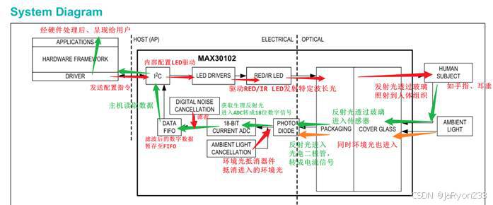 接下来,我们分析系统框图,顺着信号流向逐步理解MAX30102采集心率、血氧数据的工作原理以及实现流程,如下图所示。