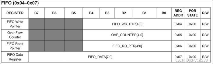这是FIFO数据缓存相关的部分寄存器,分别是FIFO写指针寄存器、溢出计数器寄存器、FIFO读指针寄存器以及FIFO数据寄存器,地址对应0x04~0x07。这些寄存器主要用于管理 FIFO 数据的写入、读取,以及记录溢出情况,如下图所示。