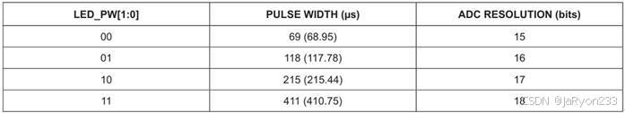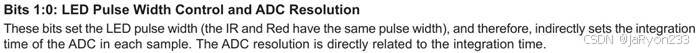 Bits 1 - 0(LED Pulse Width Control and ADC Resolution)设置 LED 脉冲宽度(红外和红光脉冲宽度相同),进而间接设置每个样本中 ADC 的积分时间,且 ADC 分辨率与积分时间直接相关。配置这两位的数值,可对应不同的脉冲宽度(如 00 对应约 69μs)和 ADC 分辨率(如 00 对应 15 位)。