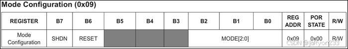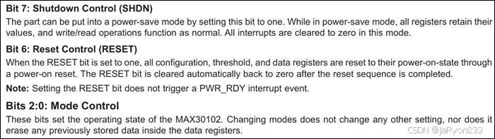 这是Mode Configuration寄存器(地址0x09),用于配置 MAX30102 的工作模式等关键参数,寄存器结构如下图所示。