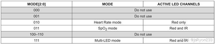 Bits 2-0(Mode Control),决定芯片的工作模式(如心率、血氧检测等),对MODE[2:0]。使用时通过三位数值组合选择模式,切换模式不改变其他设置,也不清除原有数据,组合与模式对照表如下所示。