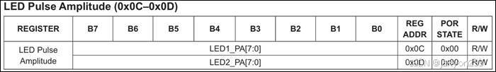 这是LED脉冲幅度相关寄存器(地址0x0C和0x0D),主要用于配置 LED 的脉冲幅度,寄存器结构如下图所示。
