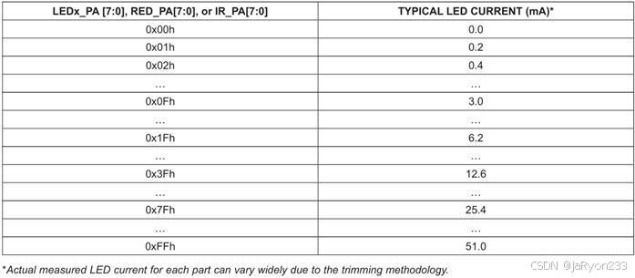 0x0C寄存器的LED1_PA[7:0]位用于设置第一路 LED(如红光 LED)的脉冲幅度;