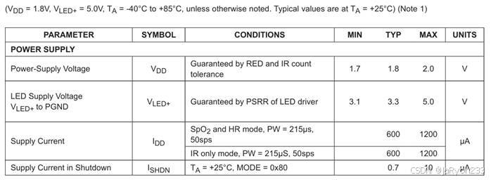 由于MAX30102模块中含有大量器件,因此涉及到的相关电气特性也比较多,这里将主要内容进行介绍。