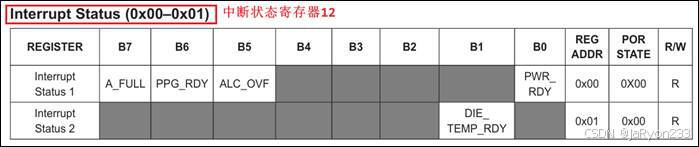 B0位是PWR_RDY,即Power Ready Flag电源就绪标志位,在模块上电并准备好采集数据时会触发电源就绪中断;