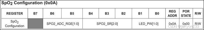 这是SPO2 寄存器SpO₂ Configuration(地址0x0A),主要用于配置血氧(SpO₂)相关参数,寄存器结构如下图所示。