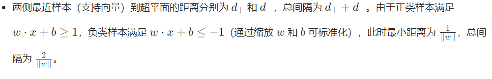 - 2.超平面与两侧最近样本的距离(即“间隔")最大化。二维空间中,两类点之间可能有无数条分隔直线,但 “正中间” 那条距离两侧最近点最远的直线,是最稳健的选择。
