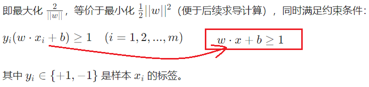 - w · x + b ≤ 1,意思是在分割线下侧距离该分割线距离大于等于