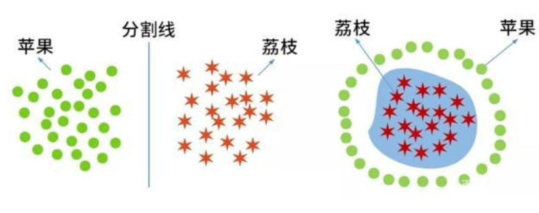 假如在课桌“三八线”的两旁分别放了一堆苹果和一堆荔枝,通过“三八线”这样一条直线就能把苹果和荔枝这两种类别的水果分开了(如左下图),这种情况就是线性可分的。但是如果苹果和荔枝的放置位置是苹果包围荔枝的局面(如右下图),就无法通过一条直线将它们分开(即这样的直线是不存在的),这种情况则是线性不可分的情形。当然,这里举例的对象是苹果、荔枝等具体实物。在机器学习上,学习分类的对象则转化为一系列的样本特征数据(比如苹果、荔枝的相关特征数据,形状、颜色等)。