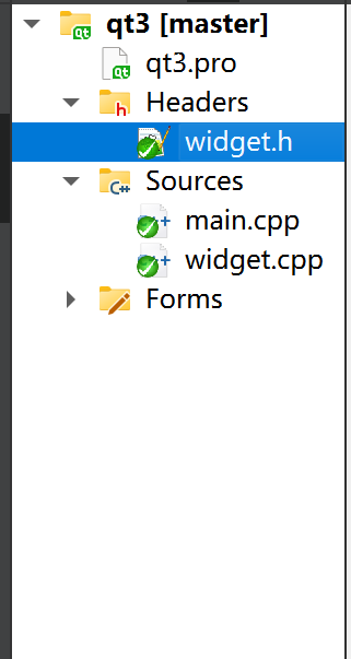 已进入qt的项目编辑区可以看见如下已经建立的三个文件,里面有预先创建的代码,我们进行解读其作用。