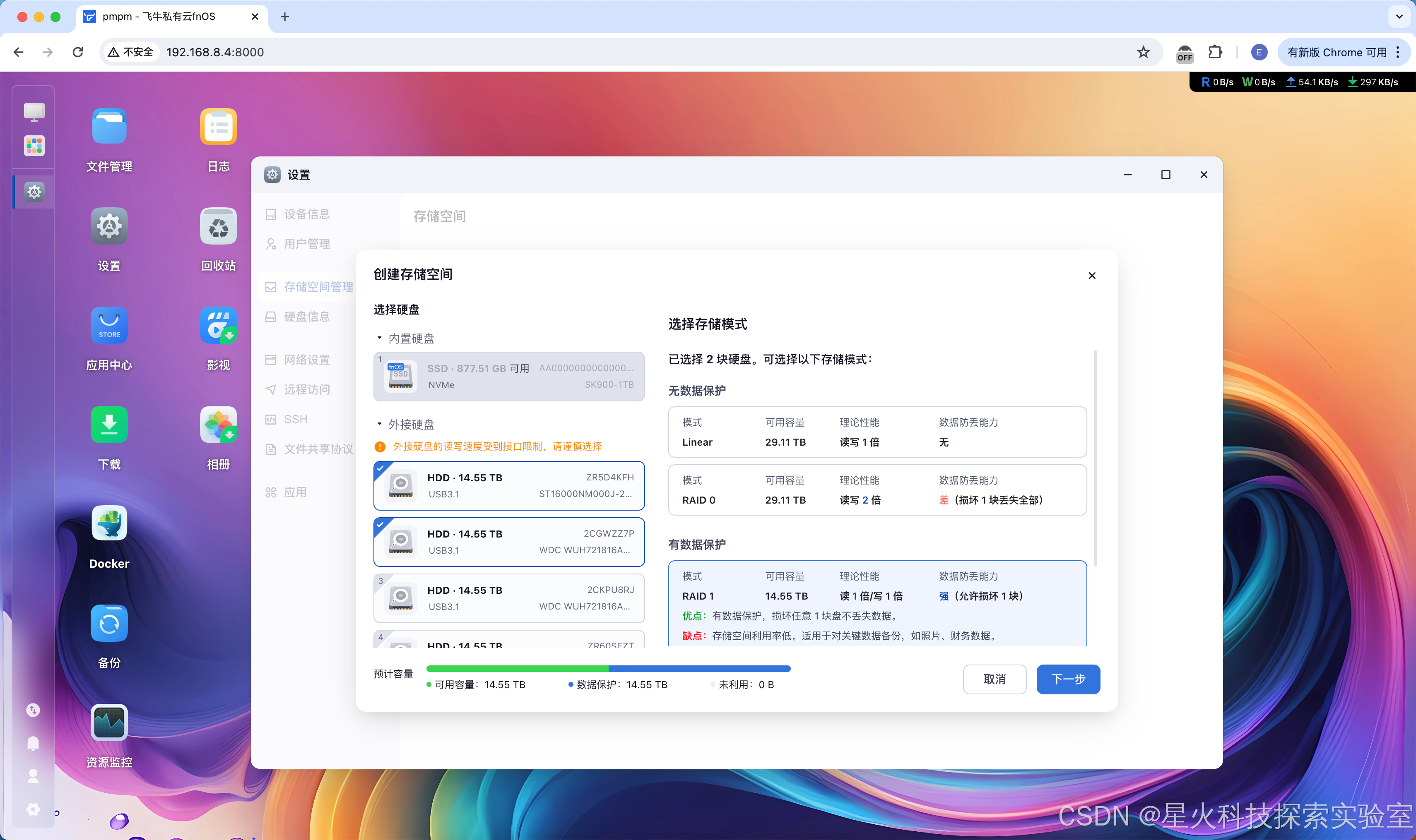 根据所选硬盘数量,右侧会动态展示可选的存储模式(如 RAID 0/1/5 或单盘模式等)。选择模式后,页面底部会显示该模式下存储空间的预计容量。确认无误后,点击「下一步」。