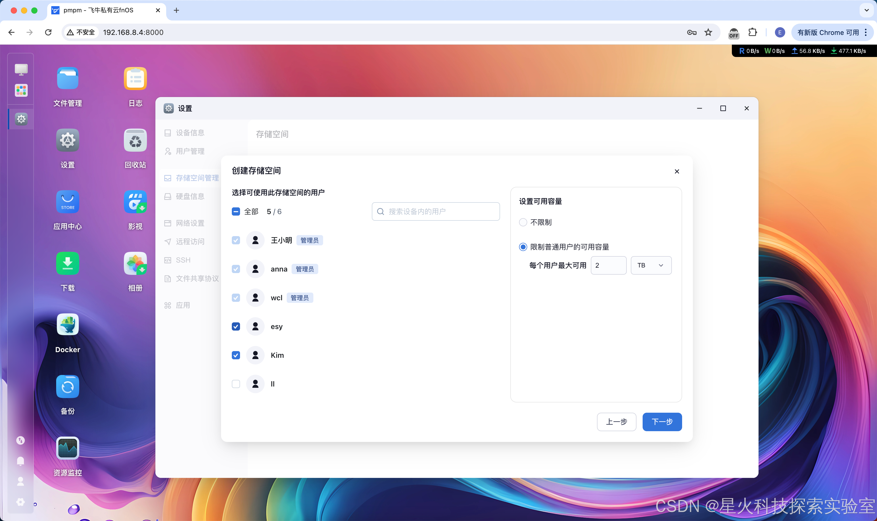 普通用户:可勾选允许访问此存储空间的普通用户,并为每个用户单独设置容量上限(后续修改同样在「用户管理」中操作)。