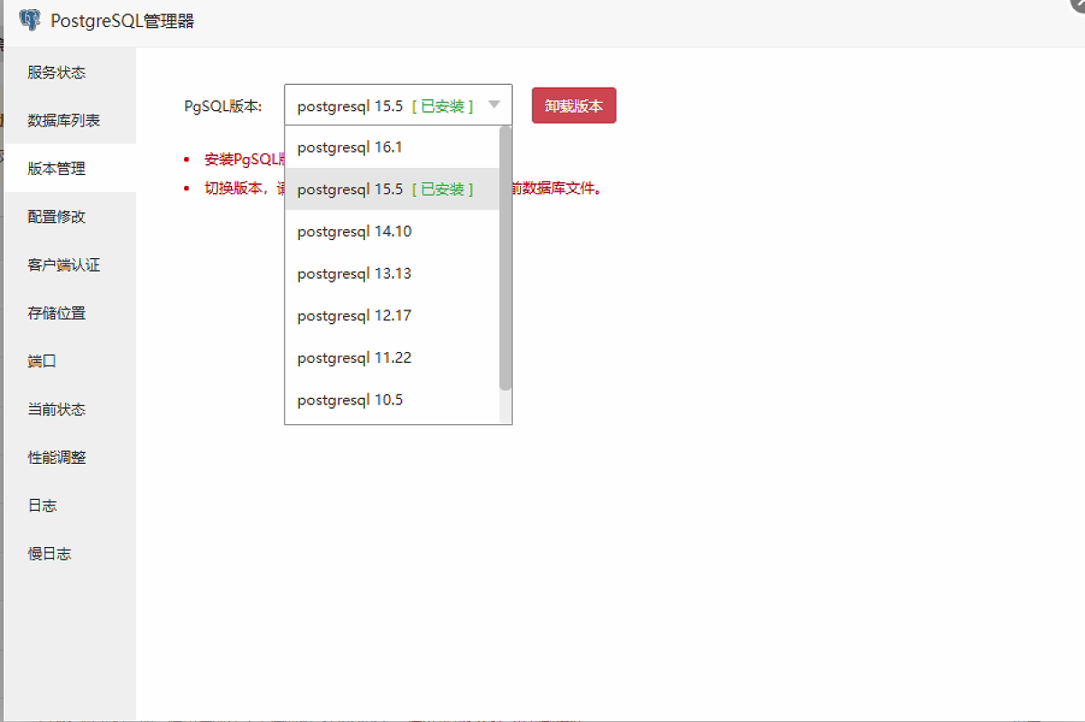 先在软件商店中安装PostgreSQL管理器,然后安装PostgreSQL 15.5,不装16.1的原因后面再说。