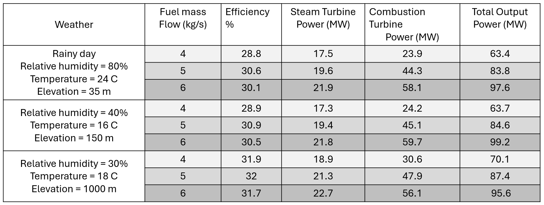 该表总结了发电厂在改变燃油费率和不同环境条件时的功率输出和整体效率。