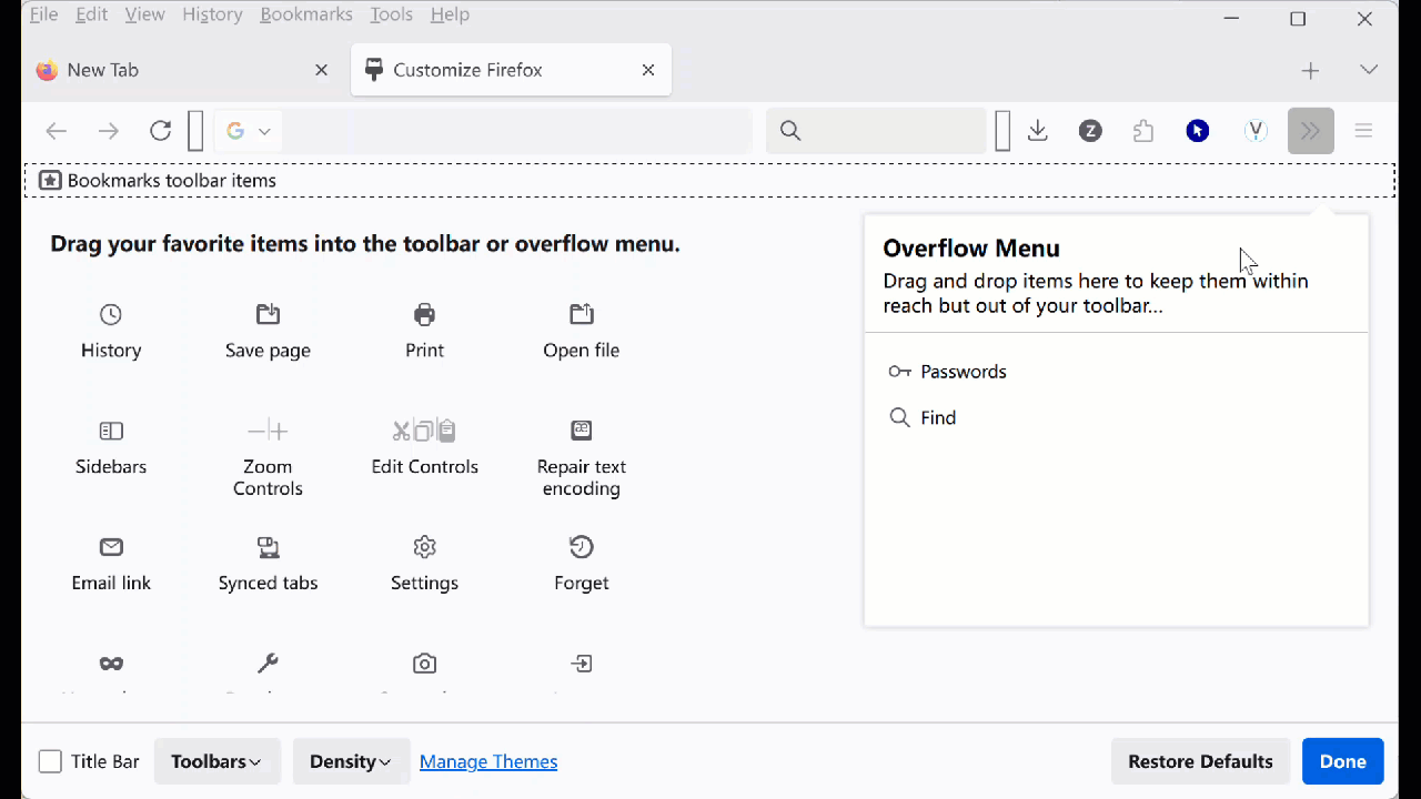 在 Firefox 中点击右上角的「菜单」按钮(三条横线)→ 选择 “Customize Toolbar…”(或右键标签栏空白处 → “Customize Toolbar…”)