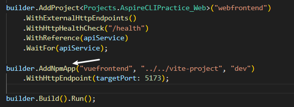 builder.AddNpmApp("vuefrontend", "../../vite-project", "dev").WithHttpEndpoint(targetPort: 5173);