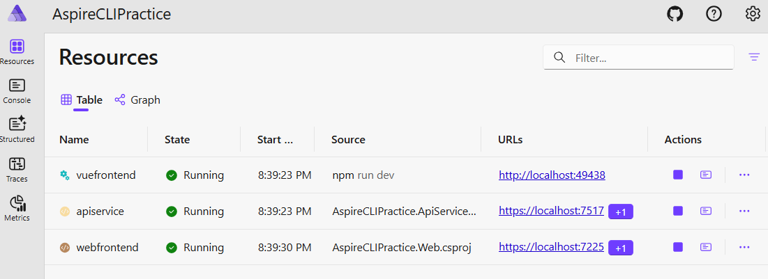2) 点击步骤5)中的aspire dashboard链接打开dashboard网站,发现三个项目都运行正常,