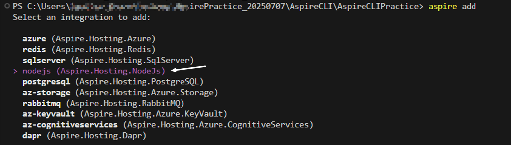 1) 在Aspire应用程序中添加Node.js integration,